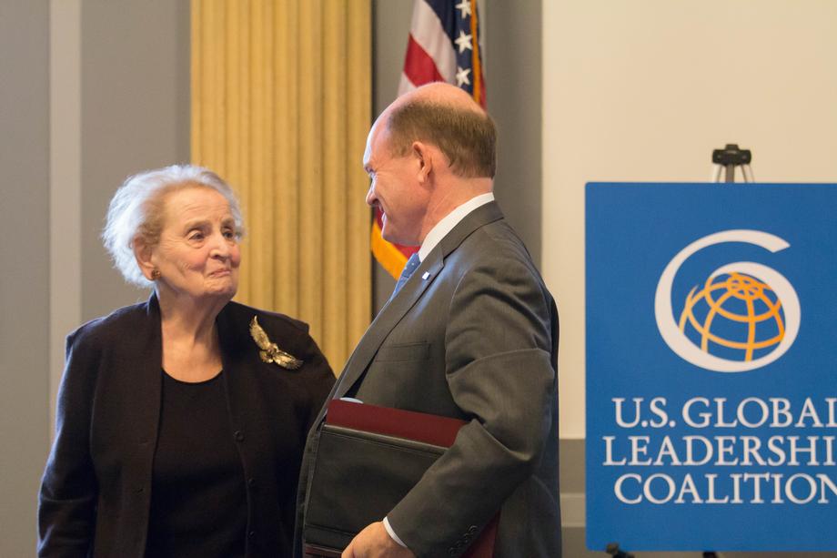 02.09.2017 Senator Coons meets with Secretary Albright at the U.S. Global Leadership Colaition Breakfast