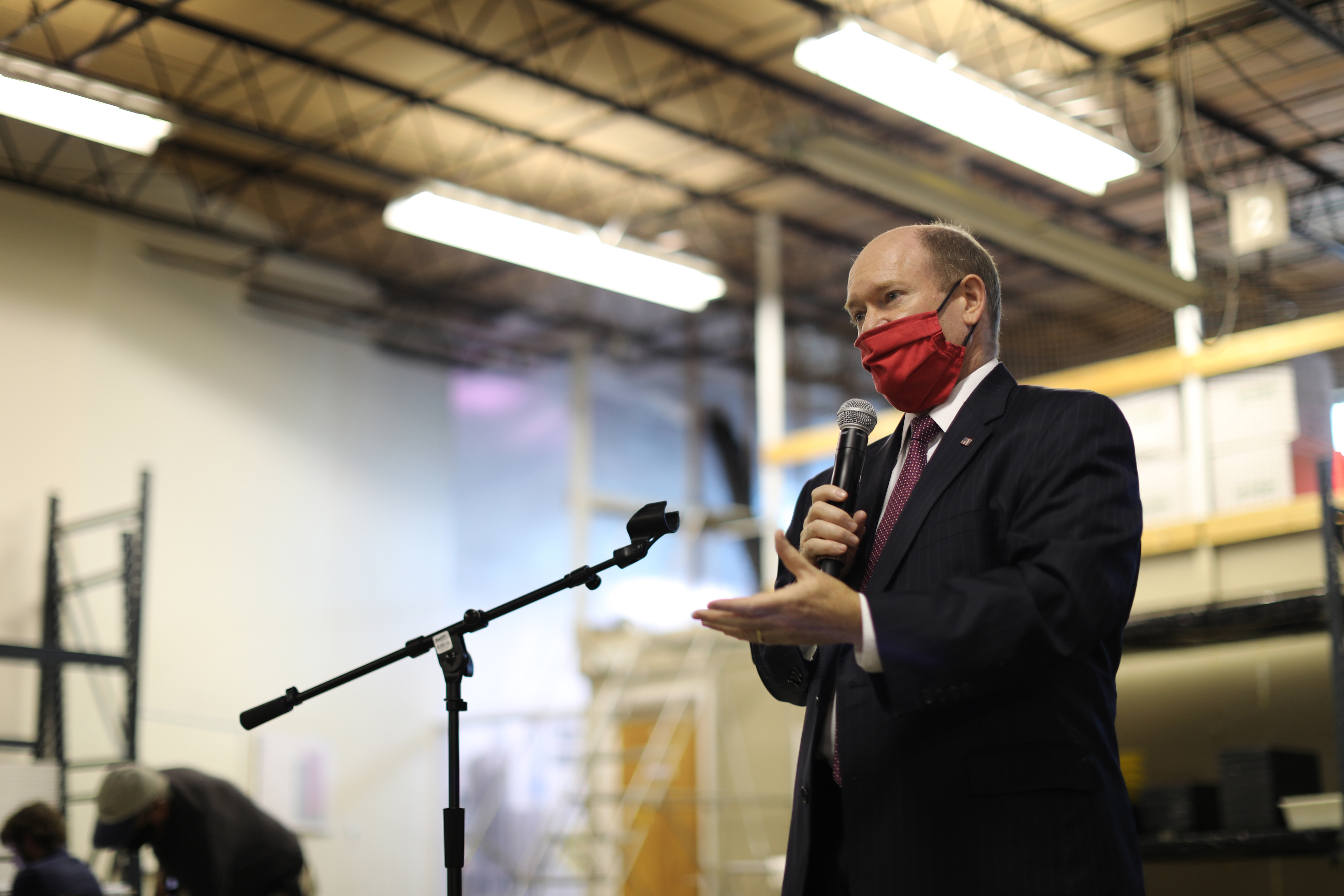 Before heading to Washington, U.S. Sen. Chris Coons (D-Del.) addresses a group of advocates working to reduce recidivism and like-minded business leaders at Second Chance Farms in Wilmington, Delaware, July 20, 2020. Coons talked about his work as an original cosponsor of the revised First Step Act of 2018 and provided details of the Driving for Opportunity Act, a bill introduced by Sen. Coons and Sen. Roger Wicker (R-Miss.) this month. This bipartisan bill aims to create incentives to stop debt-based driver’s license suspensions. Nationwide, at least 11 million people have their driver’s licenses suspended because they cannot pay fines or fees, not for any public safety reasons. These suspensions make it harder for Delawareans to commute to work to pay off the debts and places an unnecessary burden on the police to enforce suspensions, especially putting officers and citizens at increased risk of infection during a pandemic. (Photo by Office of U.S. Sen. Chris Coons/Released)