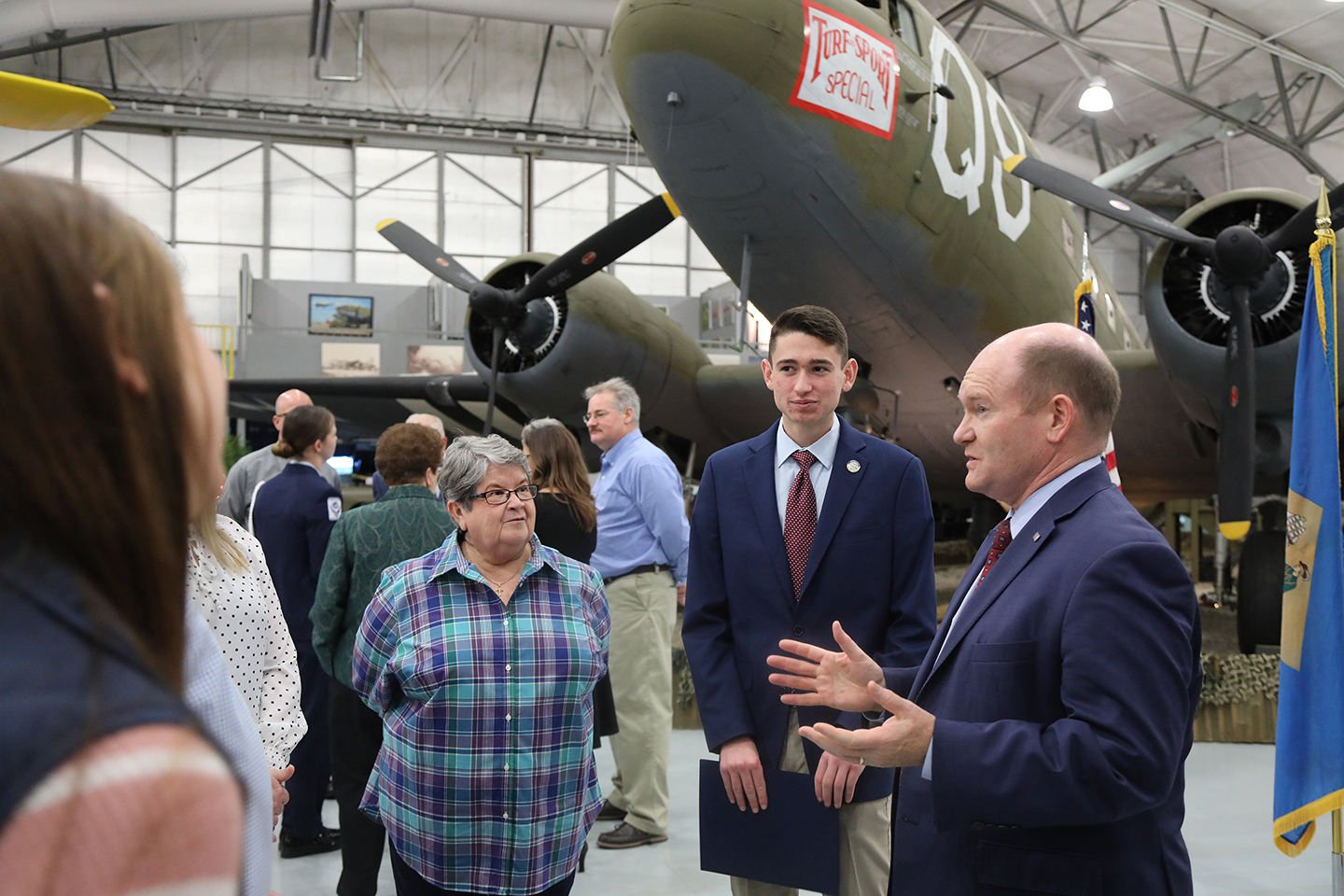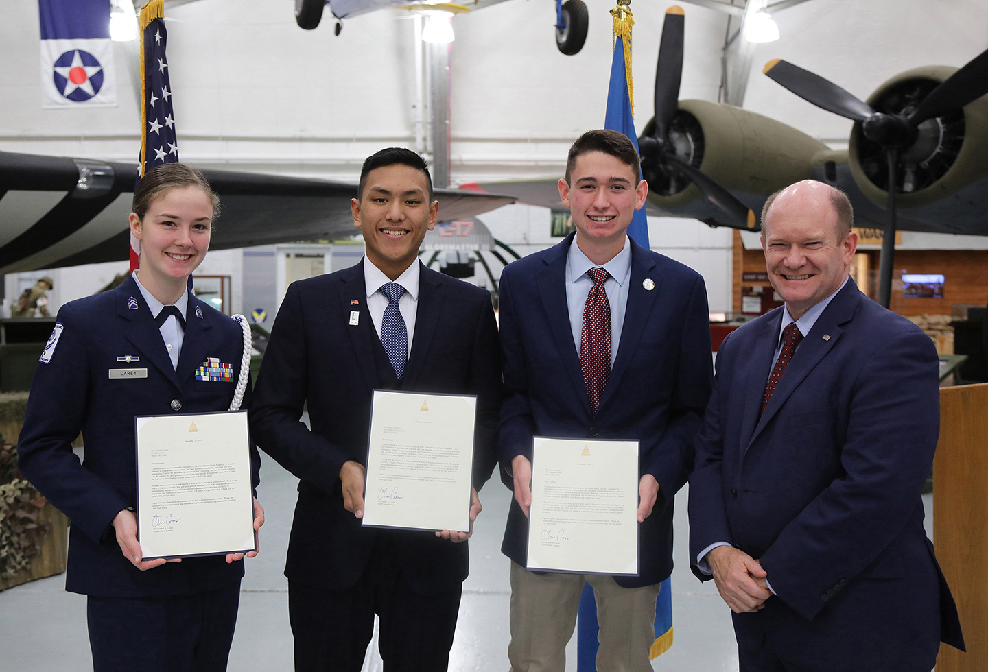 DOVER, Del. – U.S. Senator Chris Coons (D-Del.) surprised Delaware students with principal nominations to U.S. service academies during a ceremony held at the Air Mobility Command Museum at Dover Air Force Base on Dec. 14.