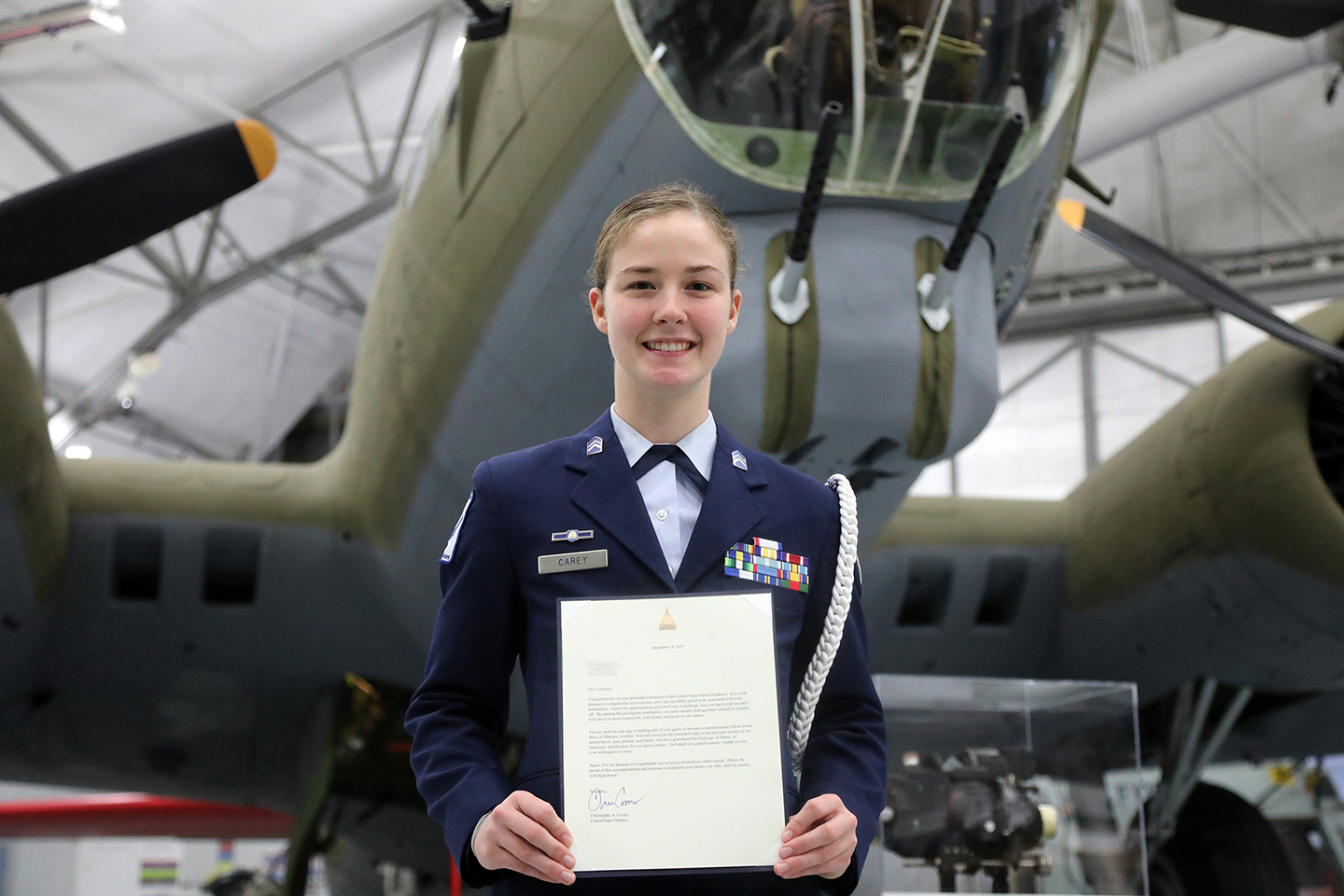 Amanda Carey stands in front of a B-17 Flying Fortress at the Air Mobility Command Museum in Dover, Del., Dec. 14, 2019. Carey, a senior at Dover High School, was named Senator Coons’ principal nominee to the U.S. Naval Academy’s Class of 2024. Download this photo: https://bit.ly/2ElbzfU.